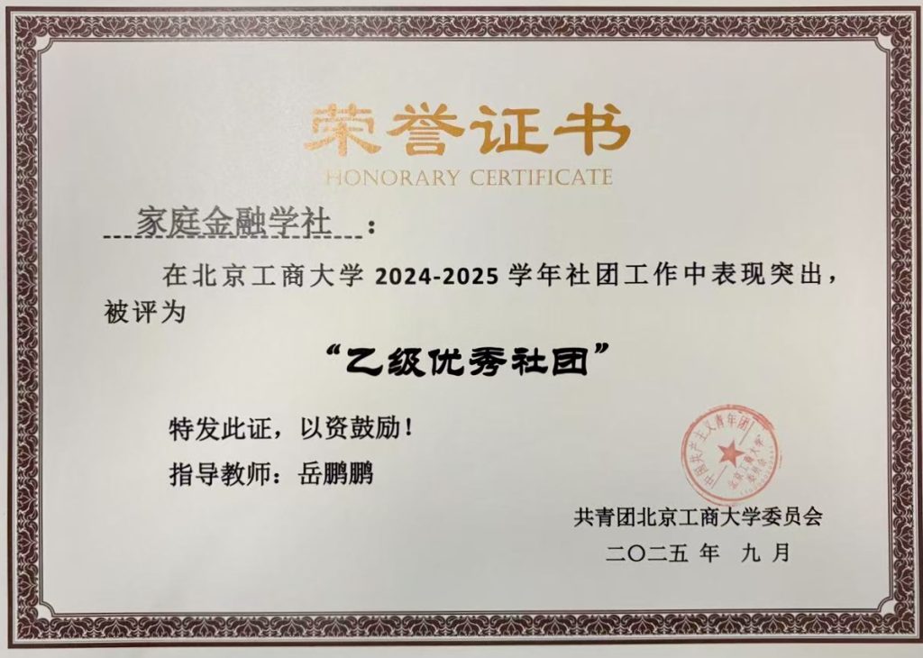 家庭金融学社在北京工商大学2024-2025学年社团工作中表现突出,被评为“乙级优秀社团”。